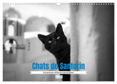 Chats de Santorin - Les princes d'Oia en noir et blanc (Calendrier mural 2026 DIN A3 vertical), CALVENDO calendrier mensuel